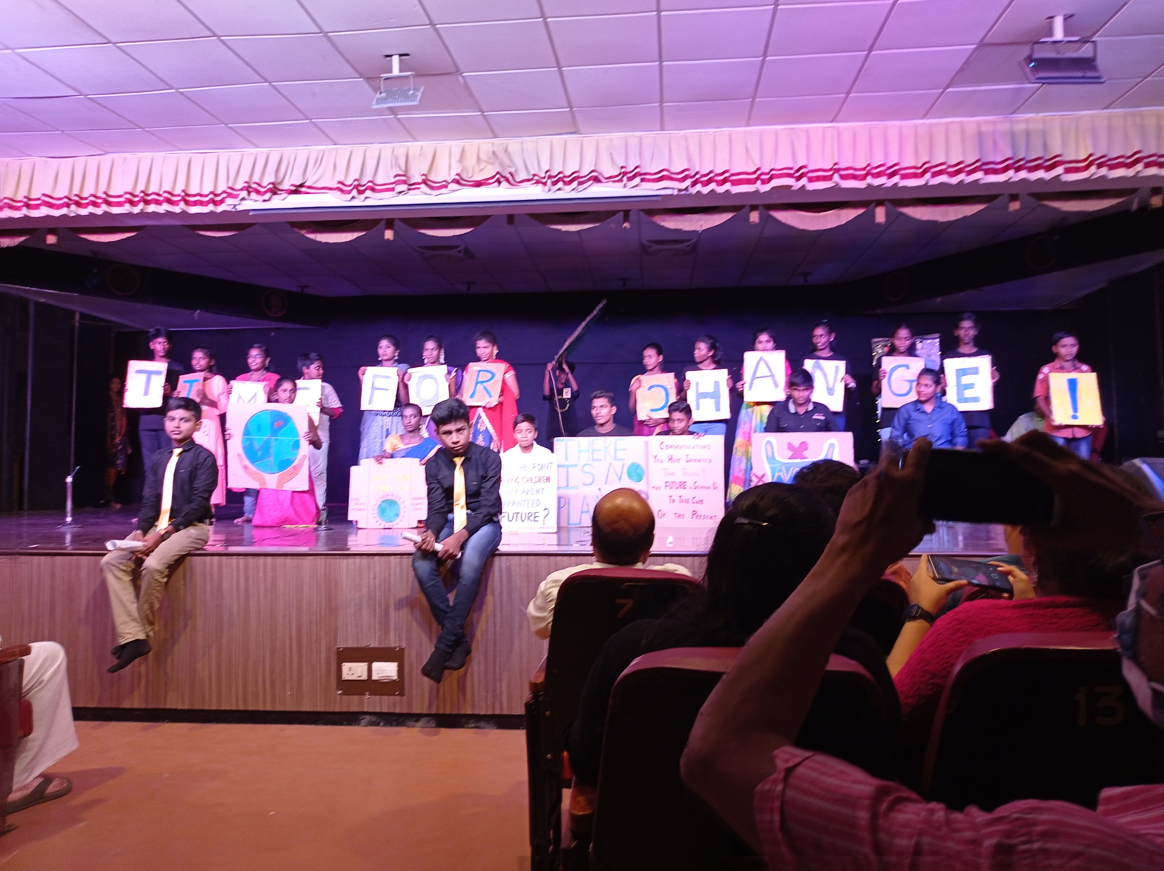 The student group that goes by the name Thenikuzhu – meaning a bee swarm inTamil – wrote the script for the climate change-themed play themselves and performed for a packed auditorium, with tickets selling for about $2 each.